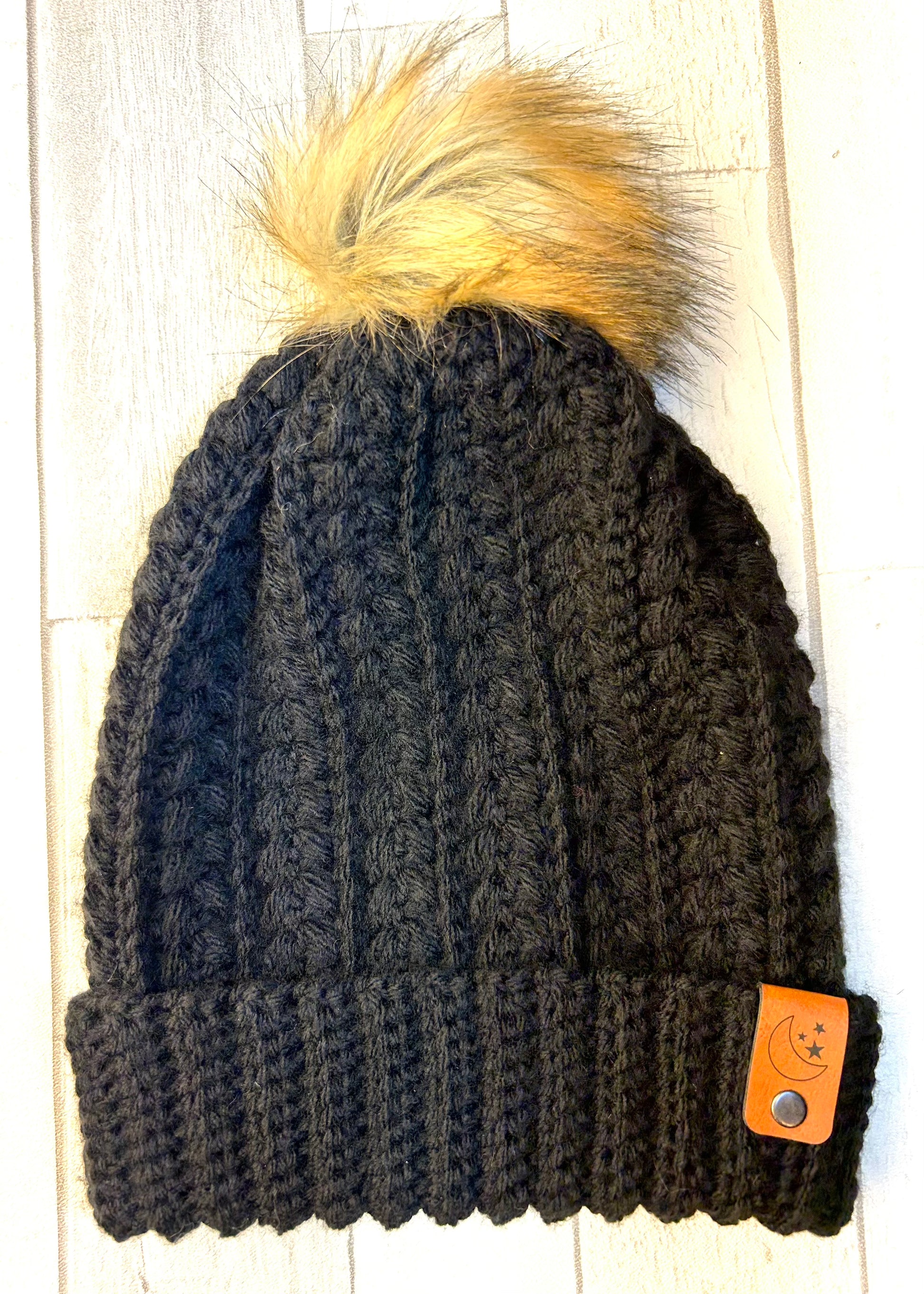 Meet the Snowy Wheat Beanie - Black, a premium winter essential built from 100% acrylic yarn for warmth, softness, and lasting shape. This cozy crochet hat features a fluffy faux fur pompom and a subtle faux leather tag, adding a touch of luxury to any cold‑weather outfit.